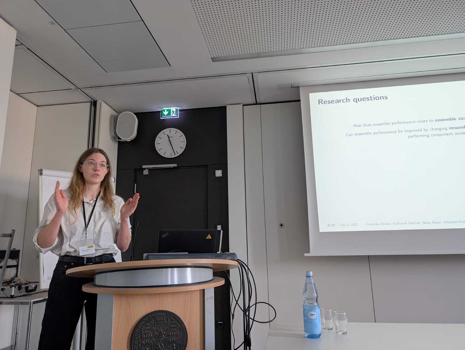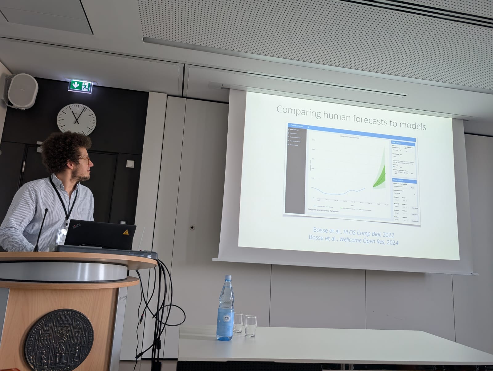 Mathematical models are essential tools for combining observed data with theoretical assumptions to generate actionable insights during disease outbreaks—but how do we know which models to trust, and how well can we actually predict epidemic trajectories? This talk explores the role of modelling in outbreak response before turning to the specific challenges of forecasting infectious disease dynamics. Drawing on systematic evaluations from Ebola and COVID-19, I examine what limits our ability to predict: unpredictable changes in human behaviour, pathogen evolution, or the models themselves? I discuss how proper scoring rules allow us to compare forecasts and what we’ve learned about the reliability of predictions at different time horizons. Beyond forecast accuracy, I present recent work on developing frameworks to assess the broader utility of modelling for decision-making and on understanding how modelling actually informs policy in practice. Finally, I consider how we can better prepare for future epidemics by investing in reusable modelling tools and collaborative efforts to systematically evaluate model performance.Friederike Becker (Karlsruhe Institute of Technology): The influence of ensemble size and composition on the performance of combined real-time COVID-19 forecasts (paper, slides).